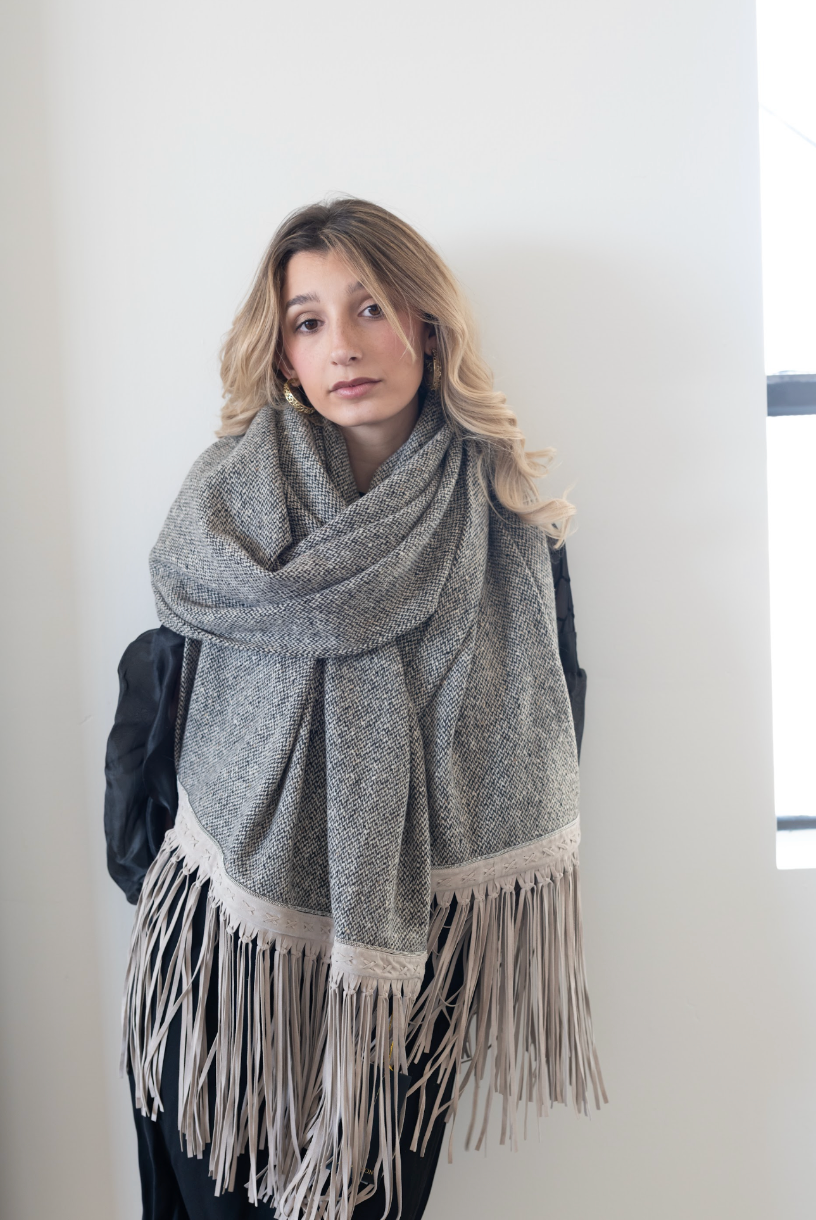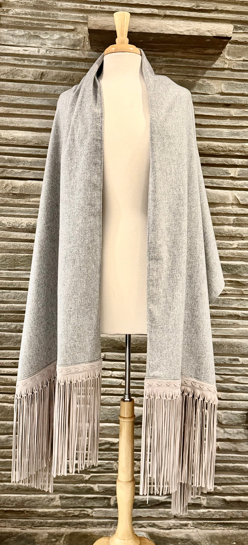 BRUNA 100% CASHMERE LIGHT GREY WITH METAL TRIM AND GOAT SKIN SUEDE FRINGE